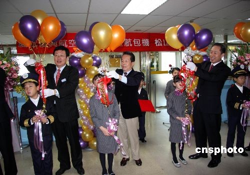 12月21日上午,大連市副市長戴玉林(左一)、臺灣復興航空公司總經理田地(左二)在臺北松山機場出席臺北-大連首航慶祝儀式。中新社發 陳立宇 攝