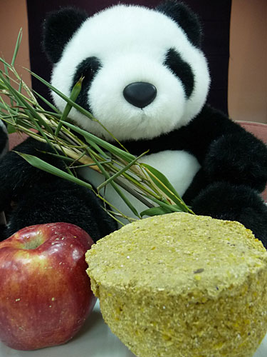 臺北市立動物園為大熊貓團團圓圓準(zhǔn)備了食物竹子與窩窩頭,圖為特制食物首度曝光。(“中央社”圖)