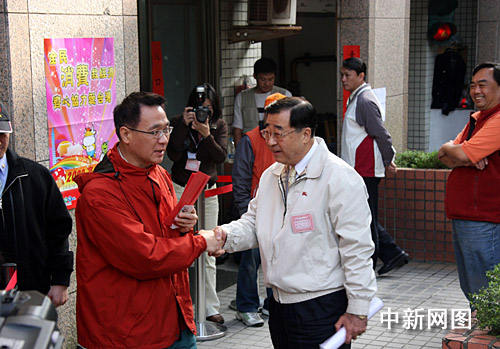 1月18日上午,備受全臺和外界關(guān)注的消費券開始在臺灣各發(fā)放所發(fā)放。圖為臺灣內(nèi)政部門主管消費券發(fā)放的負(fù)責(zé)人廖了以(右一)今天上午到消費券發(fā)放所督導(dǎo)。鼓勵臺灣民眾善用消費券,積極促進(jìn)內(nèi)需,擴(kuò)大消費。陳立宇 攝