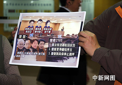 1月19日,臺北地方法院首次開庭審理前臺灣地區領導人陳水扁家弊案。傳訊陳水扁到地院準備程序庭。因庭審現場不能拍照、錄影。有臺媒出招展示今日合議庭法官與陳水扁委任律師攻放圖進行連線直播。中新社記者 陳立宇 攝