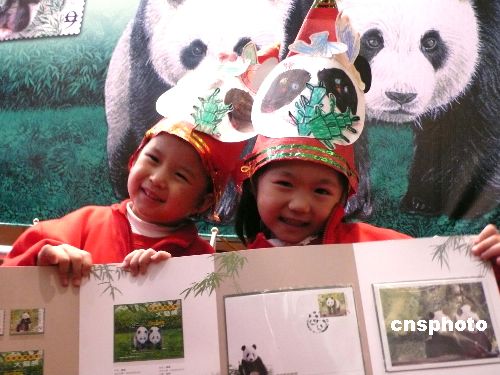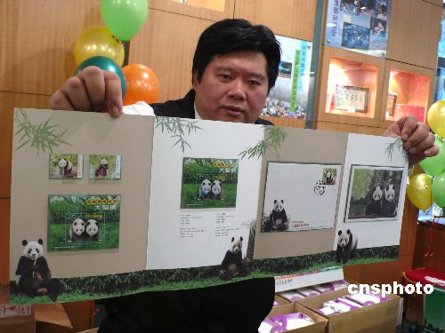 1月20日,為慶祝大陸贈臺兩只大熊貓“團(tuán)團(tuán)”“圓圓”到臺灣落戶,臺灣“中華郵政”舉行“可愛動物郵票——大熊貓”郵票及郵折發(fā)行典禮。本次發(fā)行的大熊貓郵票一組含郵票兩枚及小型張一張,分別為大熊貓團(tuán)團(tuán)(面值新臺幣五元)、圓圓(面值九元)和團(tuán)團(tuán)圓圓小型張(面值二十五元),各發(fā)行一百萬張。“可愛動物郵票——大熊貓”郵折一本,內(nèi)含上述大熊貓郵票一組、小型張樣張一張、貼有團(tuán)團(tuán)郵票的首日封及原圖明信片一組三張,每本售價(jià)新臺幣一百八十元,限量二萬五千套。中新社發(fā) 路梅 攝