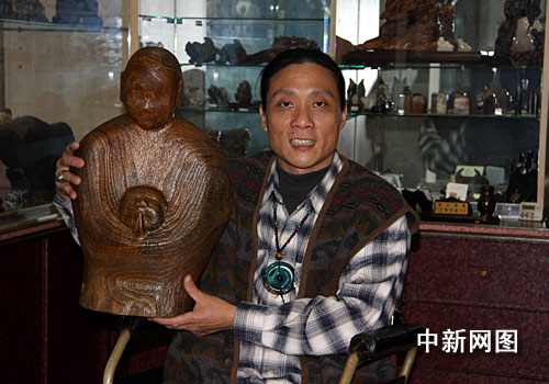 臺灣知名殘障木雕家林正發,年青時不幸因車禍而不良于行。但并沒因此喪志。反而一心致力于木雕藝術的創作。成為一個自食其力的人。曾多次獲臺灣木雕比賽大獎。圖為林正發和他的新作“佑”。以抽象的藝術手法來表現虔誠的宗教觀念。