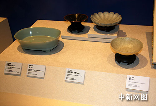 近日,為推廣臺北故宮“周末夜”活動,臺北故宮博物院在臺北火車站設(shè)置長箱型玻璃廣告廊,以高仿真度的館藏文物進(jìn)行宣介。圖為展示的仿宋代汝窯、建窯、哥窯瓷器。 中新社記者 陳立宇 攝