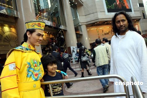二月十九日,“香港電影百年展”在時代廣場舉行,展覽內容包括香港電影業百年間的發展歷史、早期的電影海報、明星相及廣告。圖為古裝扮相的演員與游客同樂。中新社發 洪少葵 攝