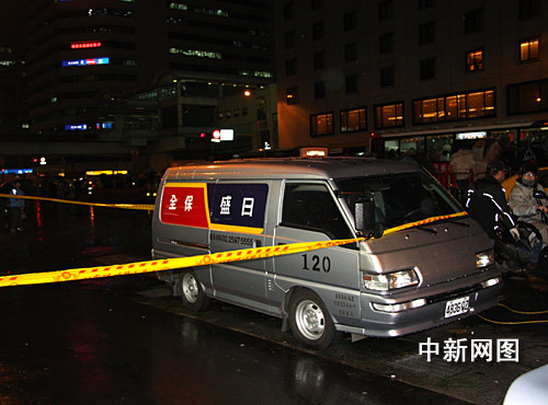 3月6日下午,臺北市南京東路三段國泰世華銀行復(fù)興分行前發(fā)生銀行搶劫案,一名歹徒在連開6槍,擊傷1名運(yùn)鈔車保全人員后,劫走兩袋共新臺幣278萬元的現(xiàn)鈔逃逸。傍晚時(shí)分,警方已在案發(fā)現(xiàn)場附近拉起封鎖線。圖為仍停在現(xiàn)場封鎖線內(nèi)的保全公司運(yùn)鈔車。中新社記者 陳立宇 攝