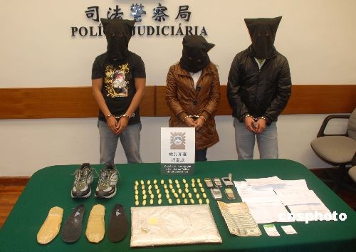 澳門警方三月八日、九日連破三起跨國販毒案,在澳門國際機場抓獲三名菲律賓籍毒販,他們分別通過體內藏毒及行李、鞋子夾帶等方式帶入的海洛因二千九百克。中新社發 畢永光 攝