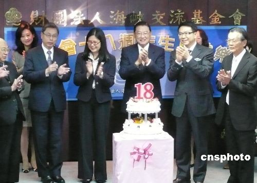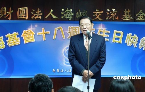 三月九日,臺灣海峽交流基金會在臺北舉辦成立十八周年慶;顒印T摃麻L江丙坤表示,兩岸“大三通”基本實現后,其效果逐漸顯現,海基會未來將會繼續推動兩岸制度性協商,共期兩岸和平,經濟繁榮。中新社發 路梅 攝