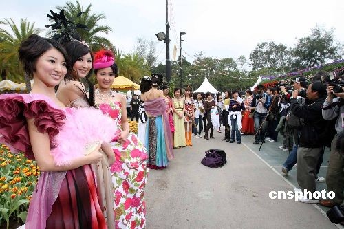 三月十二日,應屆香港小姐陳倩揚、高海寧、馬賽盛裝打扮,在香港維園花展內為“萬花喜迎東亞運”攝影比賽當日造型模特,活動吸引數百影友入場拍攝。中新社發 洪少葵 攝