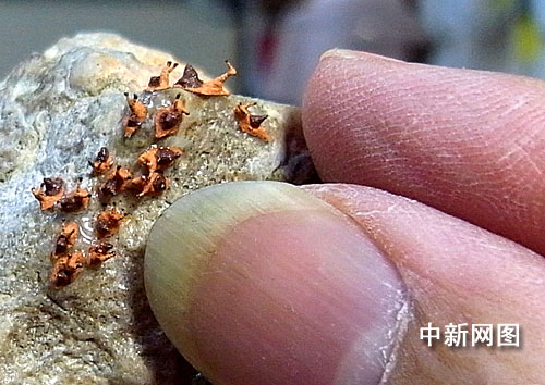 圖為臺灣著名微雕家陳逢顯創作的世界最小“蝸!比,每只蝸牛的殼、觸角、眼睛兼具,有形有神。中新社記者 陳立宇 攝