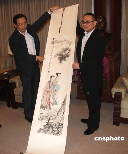 三月二十五日,由十七家大陸中央媒體負責人組成的訪問團拜訪臺灣《聯合報》。圖為訪問團團長、《人民日報》總編輯吳恒權(左)向《聯合報》贈送禮品。中新社發 耿軍 攝