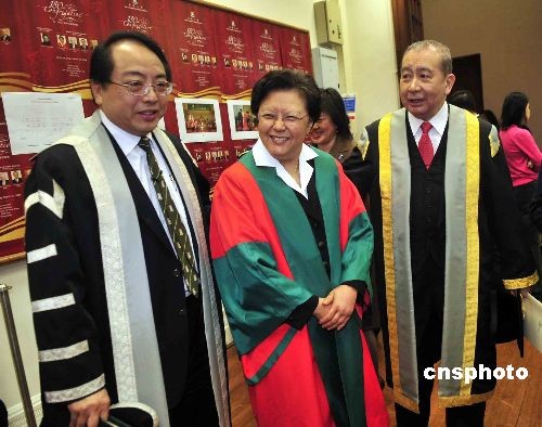 圖為港區人大常委范徐麗泰獲頒名譽社會科學博士學位,并與港大校長徐立之、港大副校監李國寶(右)合照。