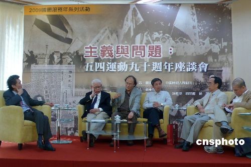 四月二十四日下午,“主義與問題:五四運(yùn)動(dòng)九十周年座談會(huì)”在臺(tái)北舉行。圖為東海大學(xué)教授高承恕、臺(tái)灣大學(xué)教授林毓生、中正大學(xué)教授孫隆基、政治大學(xué)教授金觀濤、暨南國(guó)際大學(xué)教授周昌龍以及中國(guó)時(shí)報(bào)副總編輯楊澤出席座談會(huì)(從左至右)。中新社發(fā) 鄧敏 攝