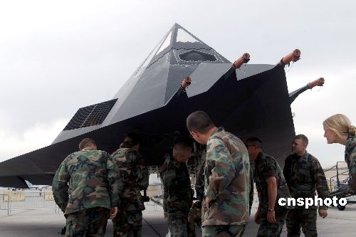 美國為紀念六十年前成立空軍,十一月在內華達州的內利斯空軍基地舉辦大規模飛機展示,美軍人員貼身參觀世界上第一種可正式作戰的隱型戰斗機F-117A“夜鷹”,此極專門用于夜間攻擊。中新社發 賈國榮 攝