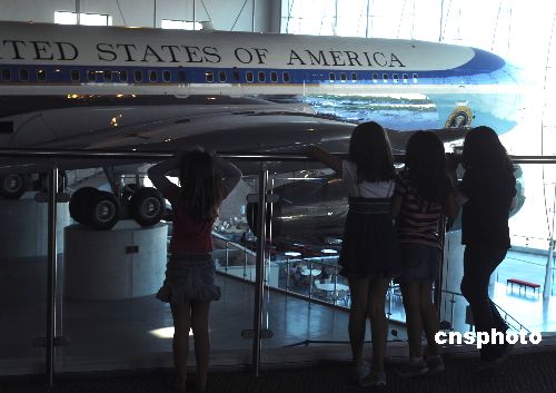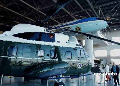 美國民眾十一月十九日參觀洛杉磯的里根總統博物館,大廳里展示當年三任總統乘坐過的空軍一號專機和海軍一號直升機。中新社發 賈國榮 攝