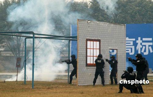 十二月二十八日,廣東佛山公安特警、武警舉行技戰演練,在反劫持人質綜合演練中,佛山特警為了解救被“劫持”的5名國家重點項目科技人員,在反恐指揮部的指令下,地面攻擊組、車輛突擊組、垂降組、情報組、爆破組、談判組迅速到達指定位置待命,然后以迅雷不及掩耳之勢發起立體攻擊,瞬間將恐怖分子擊斃,安全解救人質。中新社發 孫建駒 攝