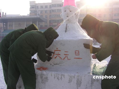 12月31日,新疆公安邊防官兵冒著零下20多度的溫度堆起雪雕,喜迎元旦新年的到來。中新社發 韓廣寧 攝