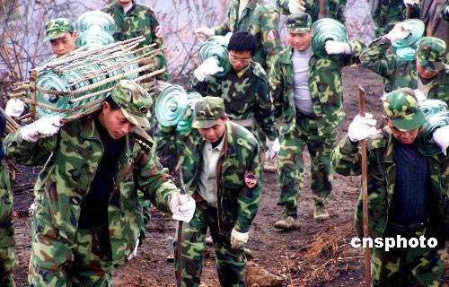 2月19日,預備役戰士為賀州市海拔1000多米的電網搶修工地運送“懸式玻璃絕緣子”。2月17日,廣西軍區組織部隊民兵預備役1100人奔赴賀州市,參加廣西電網遭受冰災損失最嚴重、修復工程量最大的“萬道線220千伏”電網搶修大決戰。戰士們開山路、頂風雨、踏泥濘,采用肩扛背馱的方式,僅用3天時間就將300多噸的電網搶修物資全部安全運送到海拔400--1000多米、長30公里的高山工地上,為全面修復賀州電網贏得了時間。中新社發 喻湘泉 攝