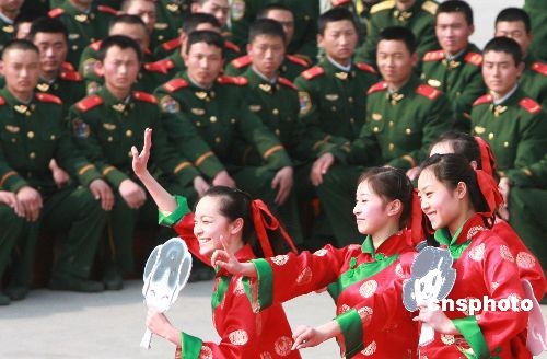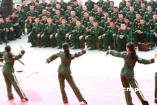 2月22日,武警江蘇總隊(duì)文工團(tuán)演員為蘇州武警官兵表演舞蹈。當(dāng)日,武警江蘇總隊(duì)政治部文工團(tuán)組織“慰問抗雪救災(zāi)一線官兵及新戰(zhàn)友專場(chǎng)文藝巡演”之首場(chǎng)演出活動(dòng),在蘇州武警支隊(duì)新兵營訓(xùn)練場(chǎng)熱鬧開演。中新社發(fā) 蘇秀 攝