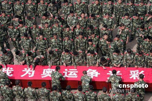 4月30日,在慶祝北京奧運(yùn)會(huì)倒計(jì)時(shí)100天活動(dòng)中,擔(dān)負(fù)北京奧運(yùn)會(huì)秦皇島賽區(qū)執(zhí)勤任務(wù)的武警河北總隊(duì),組織官兵們?cè)凇拔覟閵W運(yùn)添光彩,我為祖國(guó)做貢獻(xiàn)”的標(biāo)語(yǔ)上進(jìn)行簽名活動(dòng),以此來表達(dá)他們?cè)诩磳⒆呦驁?zhí)勤崗位之際所發(fā)出的錚錚誓言。中新社發(fā) 余洪恩 攝