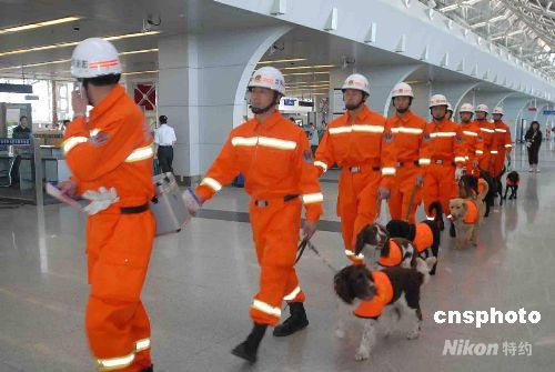 5月13日,沈陽市消防支隊30名特勤官兵帶著10條消防搜救犬,乘專機火速奔赴四川地震災區,全力參加抗震救災。 圖為出發前的特勤官兵和搜救犬。中新社發 王忠喜 攝