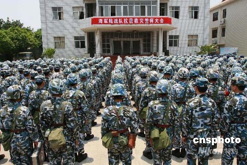 5月14日13時,中國南海艦隊海軍陸戰隊某旅搶險救災部隊第一梯隊760名官兵緊急起程奔赴四川汶川地震災區。第一梯隊的760人采取摩步化機動方式行進,預計48小時后抵達汶川災區。中國南海艦隊海軍陸戰隊將累計出動官兵2500名。中新社發 李唐 攝