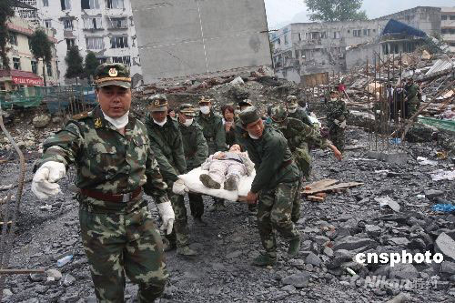 5月15日,武警官兵在汶川縣映秀鎮搶救傷員。目前約有10萬名解放軍指戰員和武警官兵參加救援。中新社發 黃榮 攝