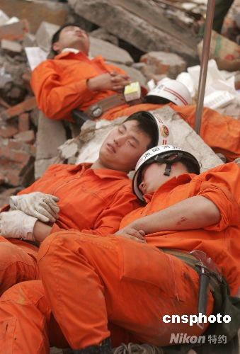 5月17日,在四川省什邡市鎣華鎮、紅白鎮等搶險現場,連續作戰的洛陽消防搶險救援突擊隊隊員們躺在瓦礫上小憩片刻。在四川地震災區,解放軍、武警、公安、邊防、消防官兵以及民兵、醫療救護人員和志愿者們,不怕危險,不畏疲勞,為搶救每一條寶貴的生命連續奮戰。中新社發 張曉理 攝