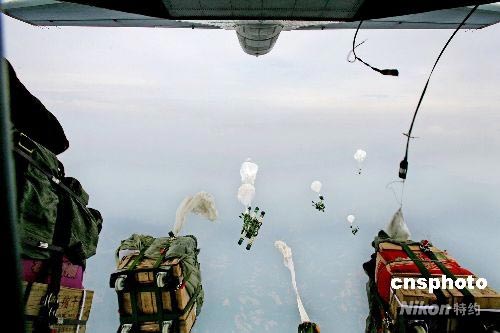 5月23日,空軍大型運輸機實施空投食品、帳篷等物資。中新社發 賁道春 攝