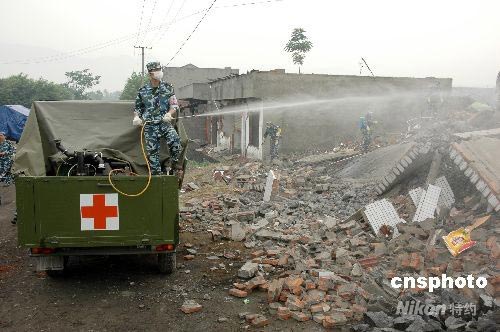 5月下旬,海軍衛(wèi)生防疫消殺突擊分隊的防疫車對四川地震災(zāi)區(qū)民房進行預(yù)防性消毒。截至到5月30日上午,由86名專業(yè)隊員組成的衛(wèi)生防疫消殺突擊分隊已完成對四川綿竹、什邡等地震重災(zāi)區(qū)60多個市區(qū)街道、村莊的廢墟、房舍、疑似疫源地等場所進行衛(wèi)生防疫和消毒殺菌,有效地控制了災(zāi)區(qū)的疫情隱患。中新社發(fā) 李唐 攝