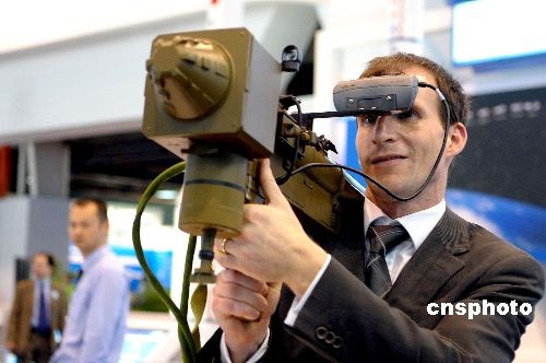 11月4日,第七屆中國國際航空航天博覽會在珠海開幕,二號館的中國防務展倍受中外關注,特別是遠程制導多管火箭武器系統、地空導彈武器系統、地地導彈武器系統、車載防空導彈系統、神州七號飛船軌道艙、滑翔增程精確制導炸彈、運載火箭、衛星等。這是外國一專業人士對中國生產的射手訓練模擬器頗感興趣。中新社發 陳文 攝