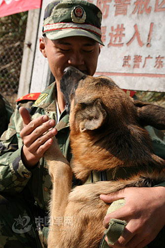 圖:邊防老兵與警犬依依惜別