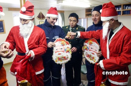 12月23日,江蘇公安邊防總隊連云港邊防檢查站的戰士扮成“圣誕老人”來到停泊在連云港口岸的外輪上,為外籍船員送去祝福和圣誕禮物,讓外籍船員在中國感受圣誕快樂。中新社發 王健民 攝