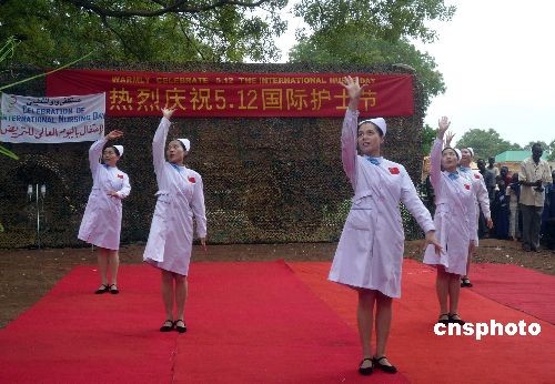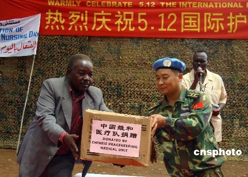 5月11日,中國(guó)赴蘇丹維和醫(yī)療隊(duì)醫(yī)護(hù)人員與蘇丹西加扎勒河州州立醫(yī)院的同行們歡聚一堂,慶祝國(guó)際護(hù)士節(jié)。歡慶活動(dòng)中,我維和醫(yī)療隊(duì)捐贈(zèng)了該院急需的抗生素、抗瘧疾、醫(yī)用耗材等六大類(lèi)近50個(gè)品種的醫(yī)療物資,醫(yī)療隊(duì)將與州立醫(yī)院開(kāi)展更廣泛的醫(yī)護(hù)交流和合作,為改善當(dāng)?shù)氐尼t(yī)療衛(wèi)生狀況做出力所能及的貢獻(xiàn)。熱情淳樸的當(dāng)?shù)孛癖娪米盥≈氐亩Y遇接待了中國(guó)朋友們。中新社發(fā) 隗蒙 陳晨 攝