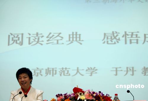 十一月二十六日,“第三期海外華文媒體高級研修班”在北京正式開班。本期研修班共邀請了來自15個國家22家華文媒體的負責人參加。圖為北京師范大學教授于丹在為研修班做題為“閱讀經典 感悟成長”的專題講座。中新社發 張勤 攝