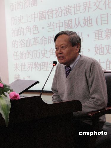 12月2日,著名美籍華人物理學家楊振寧在南開大學以《1957年宇稱不守恒在物理界所引起的震蕩》為題,發表演講。演講中,楊振寧回顧了宇稱不守恒定律問世前后的細節,以及此后的進展。他強調,從事科學研究“要有眼光、有能力、能堅持”。50年前,楊振寧與李政道因發現宇稱不守恒定律而成為首獲諾貝爾獎的華人。中新社發 田齊 攝