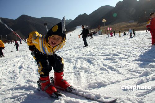 圖為一名兒童在快樂地試滑。12月2日,隨著“陽光冰雪天使”滑雪節開幕,首都青少年科技戶外運動素質教育基地在北京八達嶺滑雪場成立。當天的儀式上,百名來自奧運建設一線工人的子女和希望小學的孩子們,與一千多名滑雪愛好者首批體驗試滑,感受今冬第一場“雪”。中新社發 張愛東 攝