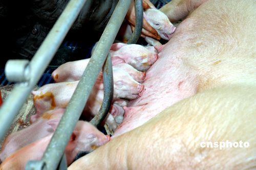 2008年1月7日12時,在哈爾濱三元畜產實業有限公司,11頭小豬順利降生,其中2頭表現出明顯綠色熒光蛋白特征。當日,東北農業大學傳出喜訊,由該校劉忠華教授主持的中國首例綠色熒光蛋白轉基因克隆豬當上“媽媽”,出生的11頭新生小豬其中有6頭為公豬,5頭為母豬,均健康活潑。中新社發 姚庭山 攝