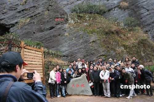 一月二十七日上午,兩岸三校師生在福建武夷山景區的大紅袍古老茶樹下合影留念。二十三日至二十七日,臺灣嘉義大學、臺灣屏東科技大學與福建農林大學的四十位師生在此間開展茶文化之旅,探尋當地的茶文化。中新社發 周文杰 攝