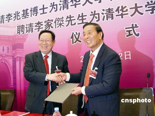 圖為在受聘儀式上,清華大學校長顧秉林院士(左)親手為李兆基頒發聘書。