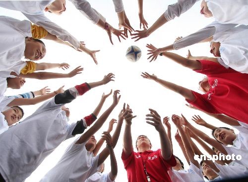 3月27日,重慶清華中學的學生正在與英國愛德華七世國王學校的師生共同開展手球、板球、跳鍵等體育活動。當日,由英國駐重慶總領(lǐng)事館牽頭進行的團隊與夢想”教育交流項目啟動,該項目是一個成功的全區(qū)項目,它通過一系列的培訓和引導,讓學生自主舉辦語言學習及文化交流和文體活動,發(fā)展和培養(yǎng)14--18歲在校學生的領(lǐng)導才能。 中新社發(fā) 賀終榮 攝
