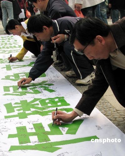 圖:北京大學生參加綠色奧運簽名活動