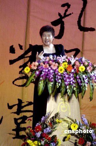 2008年4月5日晚,著名學者、北京師范大學教授于丹來到山東曲阜,作為剛剛開設的“孔子學堂”首位主講人登上杏壇的講臺。“孔子學堂”是曲阜市與中華書局面向廣大普通游客和公眾開設的文化大型講座。今后每年的4月到10月,每月都將邀請一名專家主講,一名專家現場點評,通過和聽眾的問答互動,旨在弘揚儒學經典文化。中新社發 張侃 攝