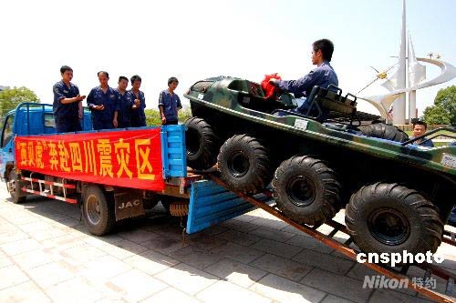 5月18日,由浙江義烏西貝文良特種車輛有限公司,捐贈給四川消防總隊(duì)的一輛“西貝虎”新型水陸兩棲全地型功能車,從義烏出發(fā),晝夜兼程趕往四川德陽,投入抗震救災(zāi)。中新社發(fā) 張建成 攝