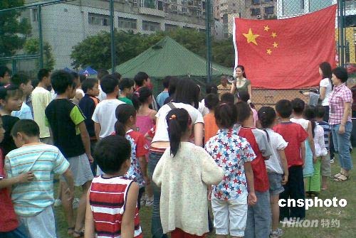 5月19日上午,在成都市青羊區(qū)體育中心安置點設(shè)置的“青羊區(qū)抗震救災(zāi)愛心家園學(xué)!遍_學(xué)。該校目前分小學(xué)、初中、高中三個班,共有80多名學(xué)生。圖為開學(xué)時舉行的升國旗儀式。中新社發(fā) 魏姝 攝