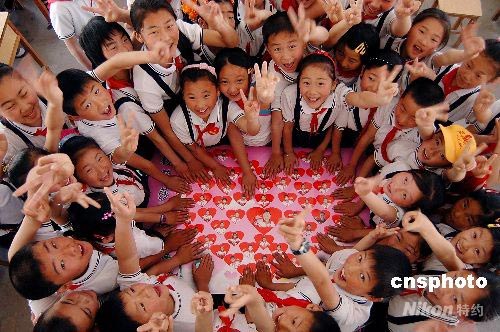 2008年5月30日,來自四川綿陽地震災區、在日照市經濟開發區第二小學上學的3名學生,在新學校與老師同學們歡慶“六一”兒童節。日照經濟開發區第二小學的師生為3名同學送上精美禮物,祝福他們和四川地震災區的小朋友節日快樂。近日,山東日照市教育部門安排3名投奔親友的四川地震災區小學生就近在日照經濟開發區二小上學,學校為這3名學生捐贈了學習用品,并減免費用。中新社發 陳為峰 攝