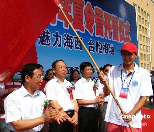 7月3日,海峽西岸2008年臺胞青年夏令營在福州開營,福建省委常委、宣傳部長唐國忠(左一)為夏令營授旗。作為全國臺聯臺胞青年千人夏令營的福建分營,本次夏令營為期6天,吸引110多名臺胞青年參加。中新社發 林維莉 攝