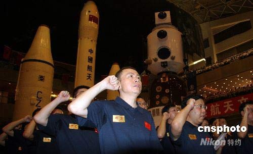 7月19日,伴隨著《飛得更高》的激揚樂曲,用于發射“神舟”七號載人飛船的——“長征二號F”運載火箭在中國運載火箭技術研究院舉行出征儀式。經過奮力拼搏,“神七”運載火箭“長征二號F”已總裝完畢、整裝待發,即將奔赴中國酒泉衛星發射中心,執行“神舟”七號載人航天飛行任務。圖為“長征二號F”運載火箭總指揮劉宇(前左一)、總設計師荊木春(前左二)和火箭發射隊隊員一起宣誓出征。中新社發 孫自法 攝