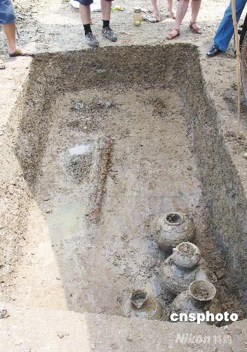 2008年7月24日,蘇州博物館考古工作者對蘇州相城區古宮黃泥村的一座西漢古墓進行發掘,該古墓出土了一批墓葬品,共有3組6件,包括青銅鏡、陶壺、陶瓿和陶罐以及釉陶,都是兩個一對的組合,不僅器形較大,釉色更好,而且保存完好。據了解,該墓葬長3.15米,寬1.60米,被確定為西漢時期,墓葬規模以及隨葬品都超過以往發現的同年代墓葬,具有一定的價值。中新社發 朱子寒 攝
