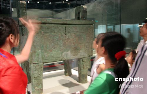 8月11日,“國寶”級文物——司母戊大方鼎在中國科技館新館的中國古代發明創造文物展上展出,成為備受觀眾矚目的焦點展品之一。中新社發 孫自法 攝