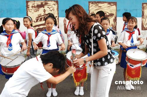 9月10日早上,在遼寧省大連市甘井子區金二小學學校門前,鼓樂喧天,學生們將鮮花獻給每位老師,表達對老師的節日祝福。當日是我國第24個教師節,各地院校師生開展多種形式的活動,慶賀教師節。中新社發 劉德斌 攝